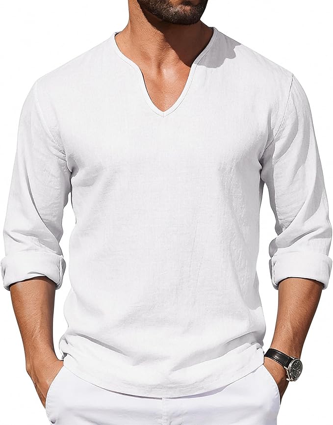 Mens Cotton Linen Shirts V-Neck